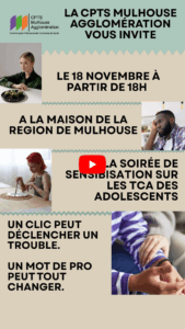 - 20h00 – Table ronde avec les interventions d’un médecin généraliste spécialisé dans la prise en charge des adolescents vivant avec des TCA, d’une pédiatre spécialisée en rhumatologie, d’une psychologue clinicienne, d’une diététicienne nutritionniste et d’une éducatrice spécialisée.