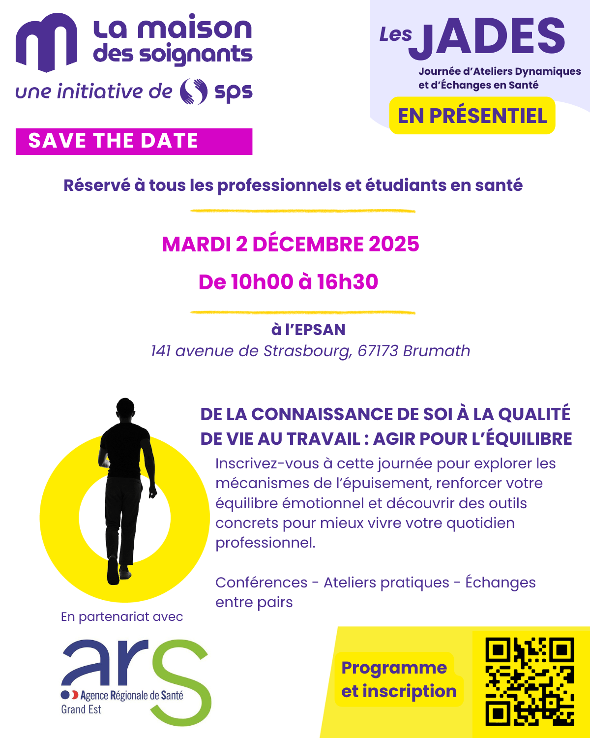 SPS, l’institut pour la santé des soignants, a le plaisir de vous inviter à une journée JADES en présentiel le mardi 2 décembre 2025 de 10h00 à 16h30 .